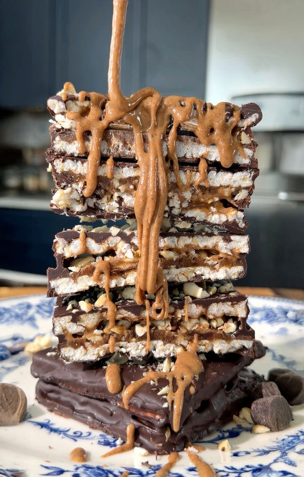 Kristi Roeder of Avocado Skillet transforms Lundberg Thin Rice Cakes into an irresistible treat, topping them with sweet date caramel, silky nut butter, crunchy nuts, and a dunk of dark chocolate. It’s an easy, feel‑good way to satisfy any candy‑bar craving.