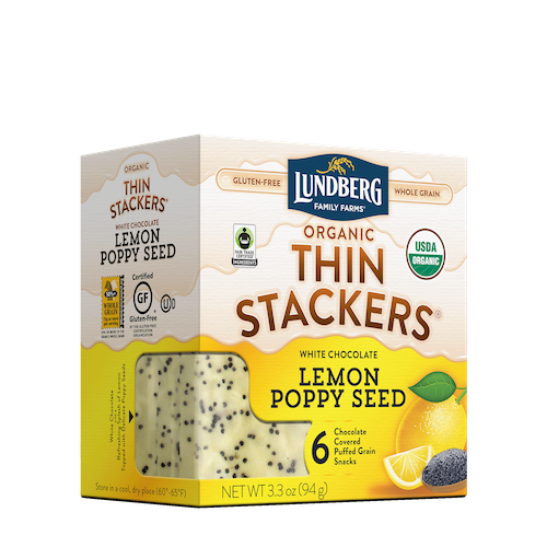 Savor the taste of toasty, whole-grain brown rice coated in creamy white chocolate with a hint of lemon and topped with delicate poppy seeds. Made from freshly milled brown rice, popped to perfection, and carefully crafted to be thin, lightly crunchy, and full of flavor. Lundberg Organic Chocolate Thin Stackers® can be enjoyed piled high with fruit, crumbled over your favorite ice cream, or straight out of the box!