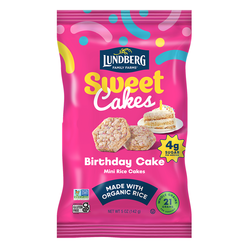 Enjoy toasty brown rice with the sweet flavor of classic vanilla birthday cake and festive sprinkles. You can snack without a second thought knowing these Lundberg Sweet Cakes are: