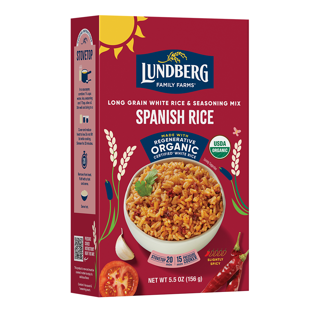 This savory Spanish Rice blends Regenerative Organic Certified® long grain white rice with vibrant tomatoes, onions, garlic, and peppers for a hint of spice. It makes for a stellar side or the start of a cheesy casserole. Just combine the cooked rice with your favorite Tex Mex ingredients, top with shredded cheese, and bake until melted.