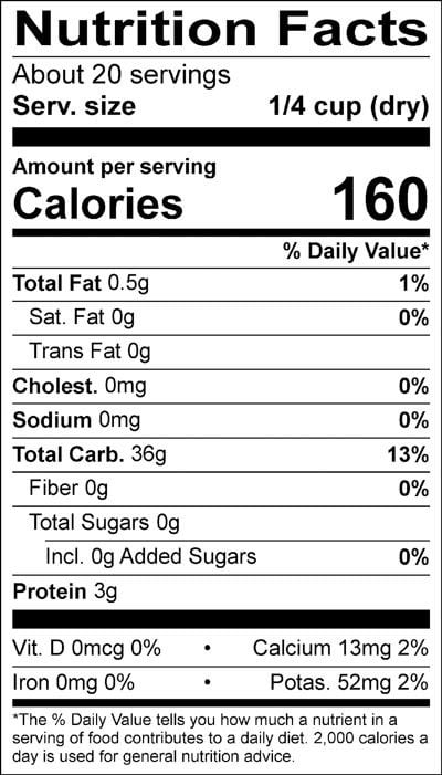 Measurement chart1 serving = 3/4 cup cooked rice |